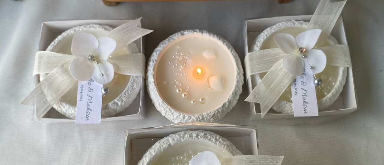 Özel günlerinize zarafet katacak el yapımı kokulu mum hediyeliklerimiz, nişan, söz ve düğün organizasyonlarınız için şık bir hatıra seçeneğidir.